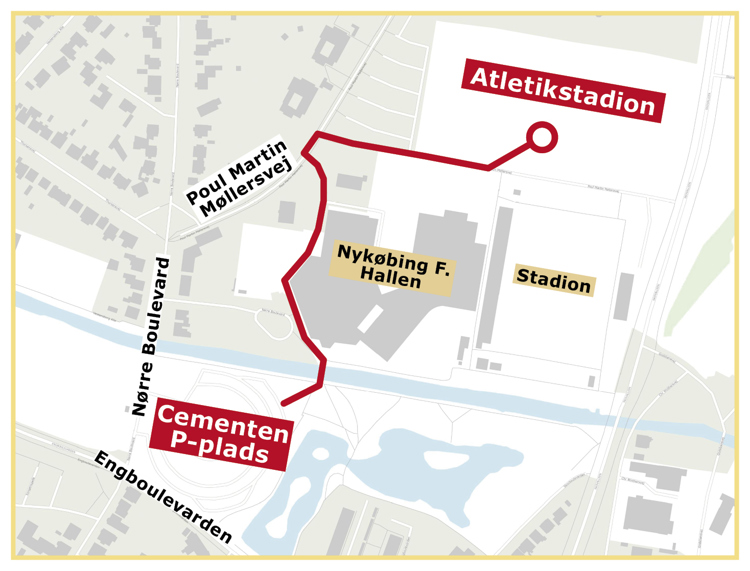 Hvis du selv kører til festen, kan du parkere ved Cementen (parkeringspladsen ved Nykøbing F. Hallerne), som ligger i gåafstand fra festpladsen.